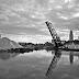 The Lorain Carnegie Bridge (Hope Memorial) lands on the east bank quite close to where the new West bound bridge will touch down. Here the early morning light is washing across its white columns.