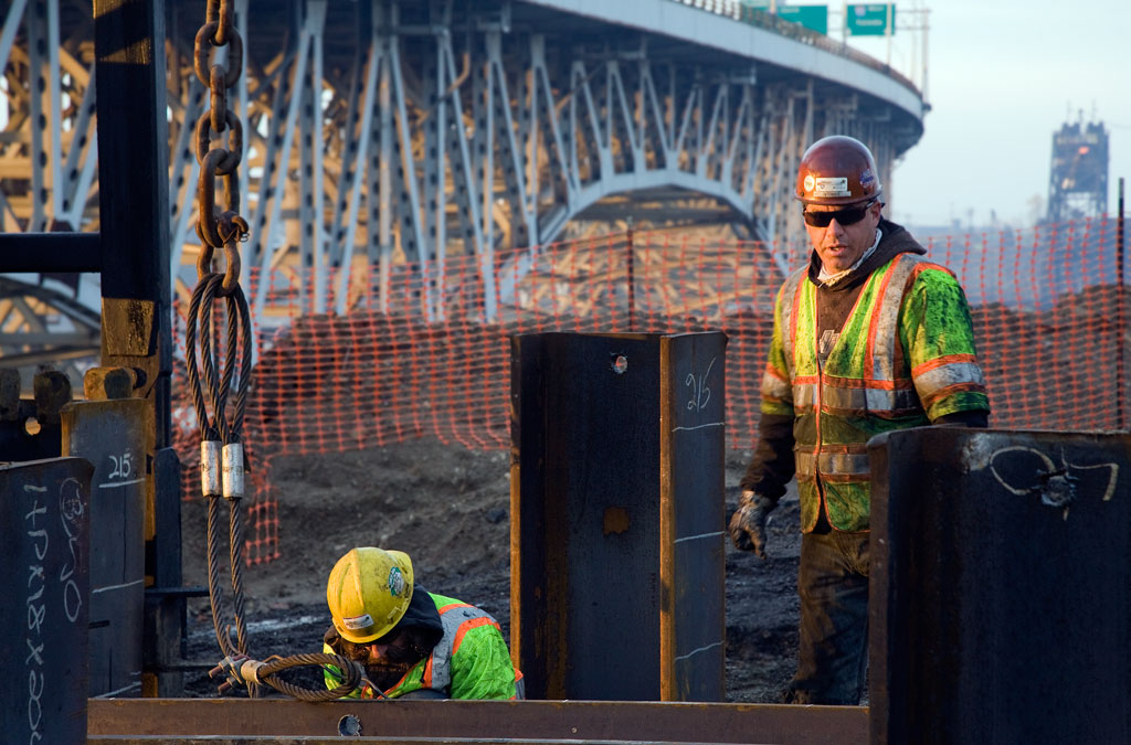 Measurements are marked off on the " H " piles so the steelworkers know how far each has been driven into the ground.