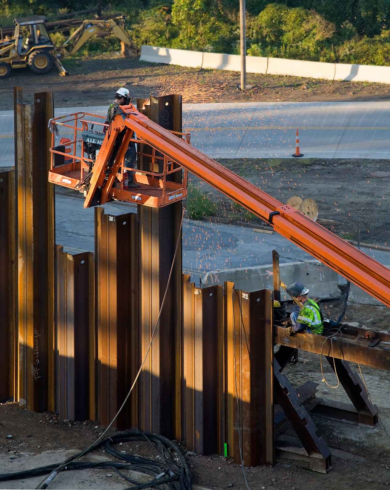 Here the sheet pile has already been driven into the softer earth at Canal Road. Steelworkers are cutting them to the desired height. By contrast, the Super H piles have a much different look.